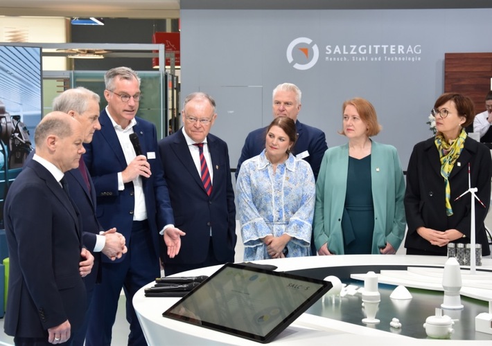 Chancellor O. Scholz with the Norwegian Minister-President J. G. Støre, Salzgitter head G. Groebler, Minister-President of Niedersachsen S. Weil, Norwegian economy minister C. Myrseth, German family minister L. Paus and German research minister B. Stark-Watzinger