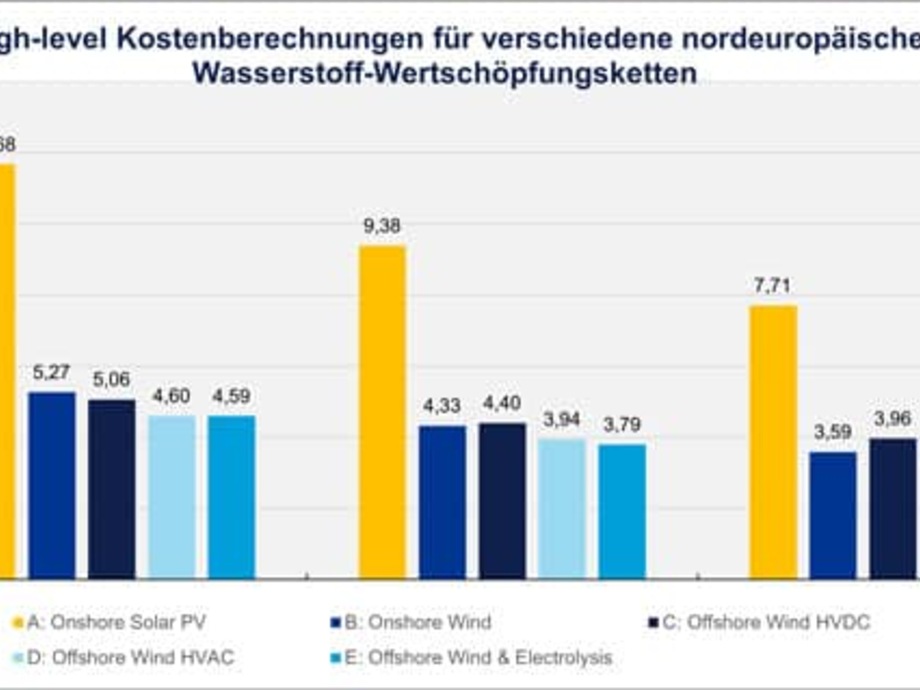 The starting point for the investigations is a comparison of five H2 value chains examined with regard to their H2 generation costs. This assumes production in Central Europe with respect to the wind and solar profiles. Compared are the production chains: onshore wind, onshore PV, offshore wind with onshore electrolysis and HVAC (high-voltage alternating current) or HVDC transmission, and offshore wind with offshore electrolysis and pipeline transmission.