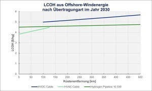 With the use of offshore wind energy, there is still the question of whether electrolysis should rather take place onshore or offshore. This aspect as well is examined in detail in the study. A comparison of the importance of energy transmission costs on total LCOH (levelized cost of hydrogen) between the three options