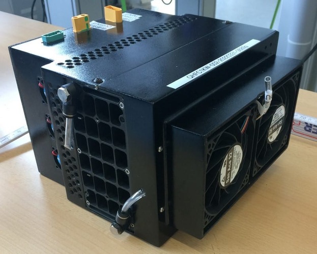 Fig. 3: Compact fuel cell system with a 1,000-watt continuous output. The fans for air cooling can be seen in the right of the picture. The hose between the fans is used for nitrogen purging.