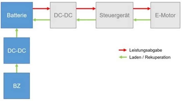 A fuel cell power system cannot dispense with a battery completely since it is needed for starting the system and for regeneration. There are various ways to configure the battery in combination with the fuel cell: If the entire driving power is provided by the battery, the fuel cell acts only as a range extender. Almost the reverse of this would be the option whereby propulsion would be provided purely by the fuel cell and a small starter battery would be used that can temporarily store the braking energy. If both power sources work together, this is called hybrid operation.