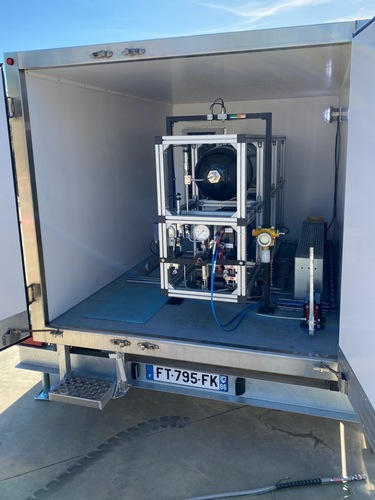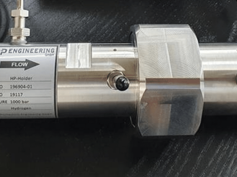 The H2 test filling station (Hydrogen Refuelling Station, HRS) at the Centre for Fuel Cell Technology (ZBT) in Duisburg was selected for the calibration of the reference meter. For the measurements, a Rheonik RHM04 CFM was installed as a reference flow meter in the "warm zone" of the HRS, i.e. upstream of the heat exchanger and the pressure control valve. In this area, the temperature is always close to the ambient temperature and the pressure is constantly high, typically around 90 MPa. A mobile HRS primary flow standard was used for the calibration, which was connected directly to the HRS and thus took the role of a vehicle.