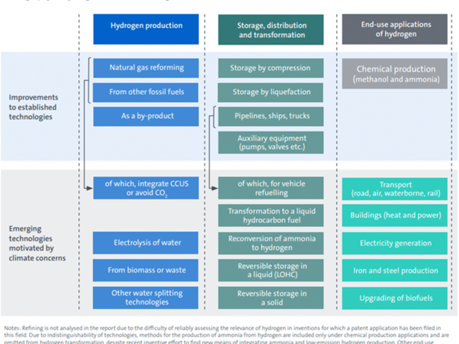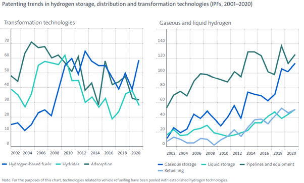 Current hydrogen storage and transport remains the subject of many challenges, such as the substantial weight and volume of storage systems, energy losses associated with compression and liquefication, and durability of storage systems. Patent trends across hydrogen transport and storage can be seen in the figure below from the EPO/IEA report, which shows a strong focus on infrastructure to support hydrogen uptake.