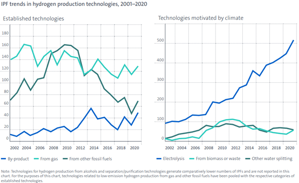 The EPO/IEA global trend analysis found that hydrogen production technologies accounted for the largest number of hydrogen related patents in the 2011 to 2020 period. Technologies motivated by climate concerns generated nearly 90 % of International Patent Families (IPFs) related to hydrogen production in 2020. With a strong focus on decarbonising hydrogen production, there has been a rapid increase in electrolysis related patents and a substantial decrease in patent applications for hydrogen production from fossil fuels. These trends are visible in the figure below from the EPO/IEA global trend analysis report.