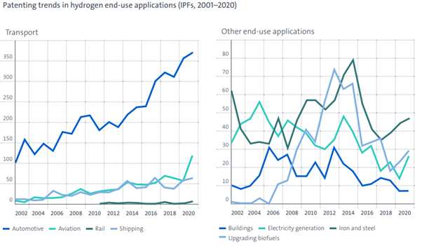 Challenges still persist with on-board vehicle storage of hydrogen as well as how to convert the chemical energy from hydrogen into motive force. Within the automotive and aviation sectors, patent applications for means of propulsion dominate. In particular, hydrogen fuel cells account for a significant portion of innovation in the last decade. For aviation, it is expected that fuel cells may be viable for shorter haul journeys. For longer haul flight, it is expected that the higher power of turbines and energy density of hydrogen-based fuels will offer greater performance than the combination of a fuel cell and motor.