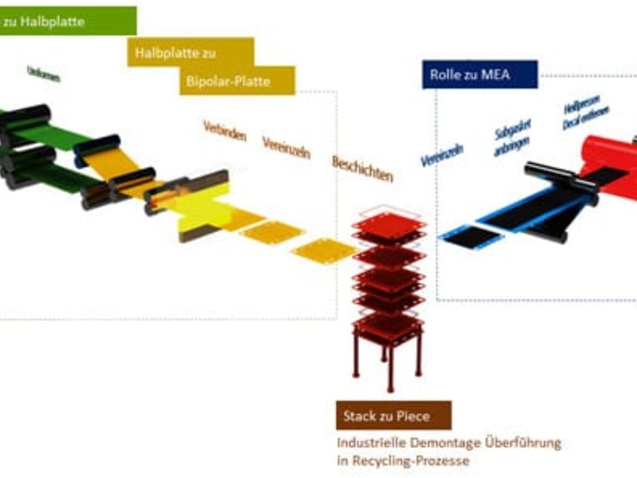 Further process steps are laser-based cutting and joining processes and finally a special testing procedure that concludes the bipolar plate production (HP2BPP). This is combined with a membrane electrode assembly that has been manufactured either through a decal coating method using screen printing or via a slot die coating technique (R2MEA).