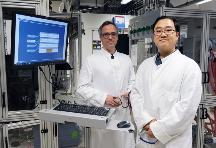 Fig. 3: Prof. Malte Behrens and Dr. Shilong Chen in their Kiel laboratory in front of a test stand for new catalysts