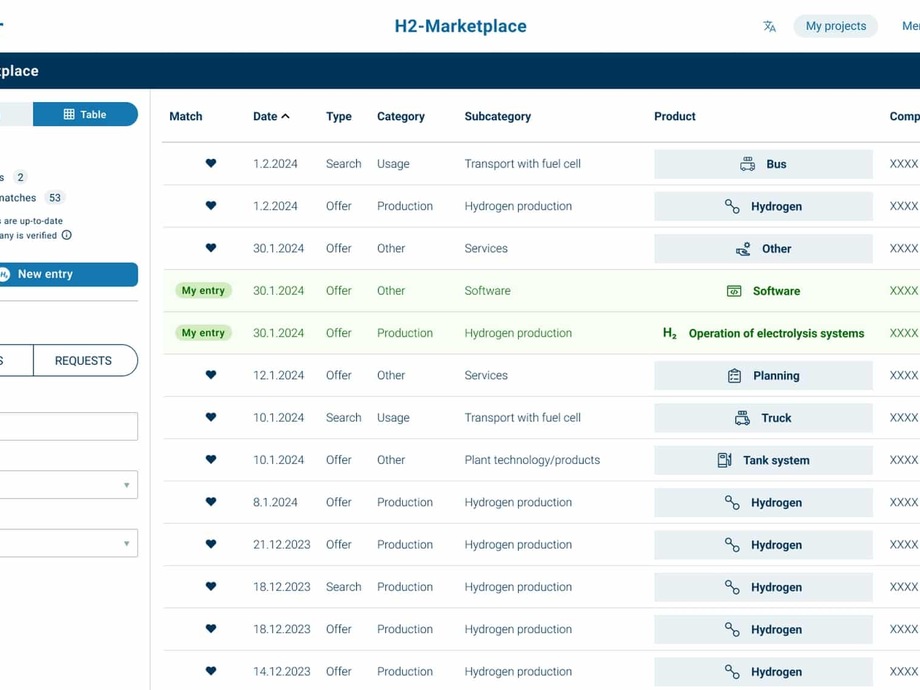 The hydrogen marketplace is being continuously expanded and improved by Localiser RLI GmbH. In September 2023, the new matching function was introduced. This function automatically suggests potential business partners for each hydrogen player, making networking much easier. The marketplace provides an overview of all hydrogen offers and requests. It is possible to filter according to specific criteria such as company, category and project status. Clicking on a result opens a chat window that allows registered users to directly contact other companies. A summary of all matches can also be viewed in this overview. The marketplace can also be integrated on other websites as a white label.