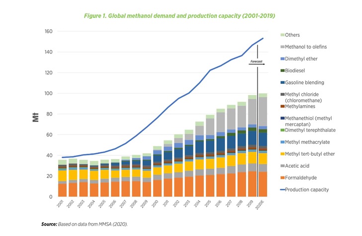 By 2050, the global production could lie at 500 million tonnes annually, estimates IRENA and the Methanol Institute. If these are generated from natural gas and coal, like so far, the greenhouse gas emissions from methanol production would rise from the current 0.3 Gt of CO2 equivalents to 1.5 gigatonnes per year.