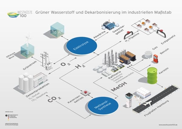 Westküste100/Raffinerie Heide: At a real-world H2 lab in Heide in the state of Schleswig-Holstein, a consortium aims to investigate a whole range of hydrogen technologies – from cavern storage to methanol synthesis (see H2-international Oct. 2020). The last is to take place at Raffinerie Heide. The CO2 is to come from a cement plant, the hydrogen from an electrolysis plant. However, the final project description regarding methanol synthesis still only mentions a feasibility study. The challenge, it is said, is to integrate the large-scale process that takes place between the cement plant and the refinery. Responsible for the corresponding work package is Thyssenkrupp. The real-world lab is running from 2020 to 2025. A scaling up to “several hundred megawatts” of electrolysis capacity subsequent to the lab, according to the project description, is the goal. In the end, kerosene for Hamburg Airport (Hamburger Flughafen) is to come out of this, is the vision.