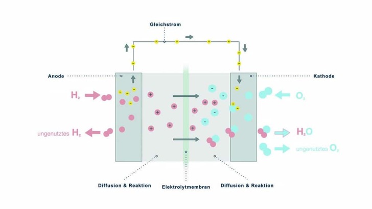 The electrons that split off on the anode side travel to the cathode via a closed electrical circuit. Used in this are the electrical as well as thermal energy. In a vehicle, this electrical energy can then be used, for example, to charge a battery or directly for the electric drive. In the stationary area, for example for the self-sufficient energy supply of a house or building complex with electricity and heat, the fuel cell ensures emissions-free living with renewable energies. When used to secure critical infrastructures such as signal boxes or data centers, hydrogen fuel cells are used instead of diesel generators and enable the use of CO2-neutral energy.