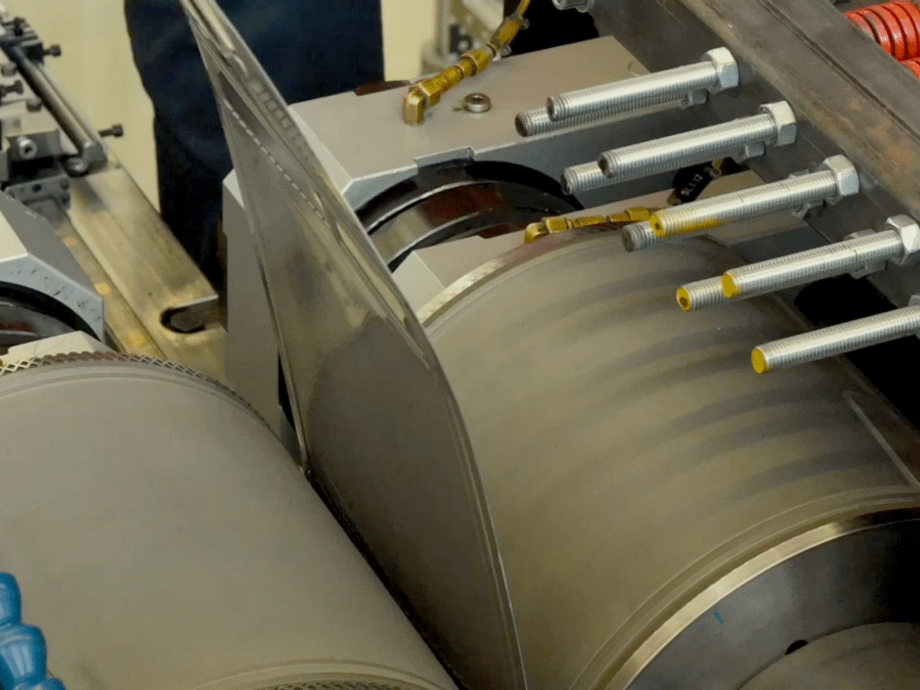 Fig. 2: Rotary stamping of bipolar plates: The structure of the bipolar plate is stamped by a pair of rollers. The main advantage of this method is the high processing speed that leads to a substantial increase in output figures, scaling effects and finally to a significant reduction in cost.