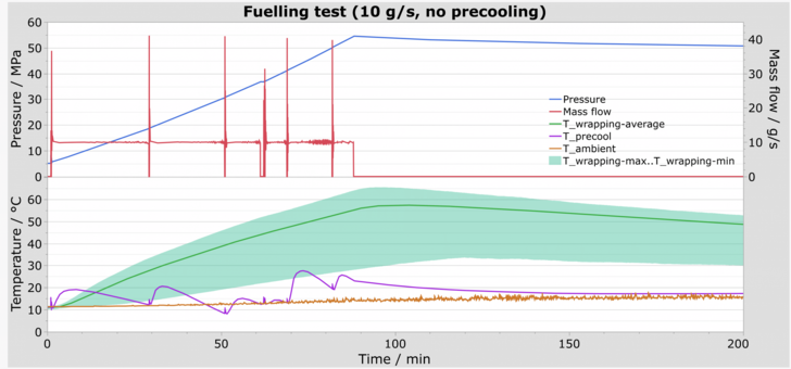 For the filling tests, the various operating parameters comprised the precooling temperature of the incoming hydrogen, the starting pressure of the tank and the filling speed. Here the focus was not on filling the tank at the usual controlled pressure ramping rates but on filling at a constant mass flow rate.