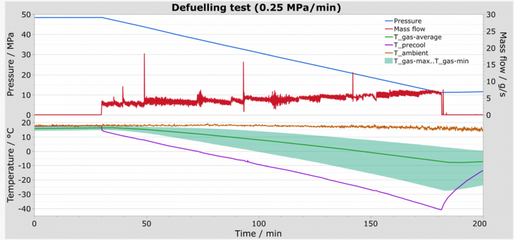 The discharging tests were in turn carried out at constant pressure ramping rates. This led to interesting results in relation to the temperature behavior of the gas both in the tank as well as in the gas flow coming from the tank.