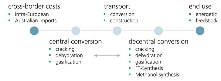 Between 3,400 and 16,000 euros per tonne of hydrogen equivalent (EUR/tH₂eq): This is how far the range of provisioning costs found in the study extends between the different use cases. In this, the import costs, with a range of 41 to 100 percent, make up the majority, whereas the costs for domestic redistribution, averaging five percent of costs, comes out comparatively low. In the economic evaluation were included the costs for the provision of hydrogen and its derivatives. The specific transport and conversion costs were additionally included.