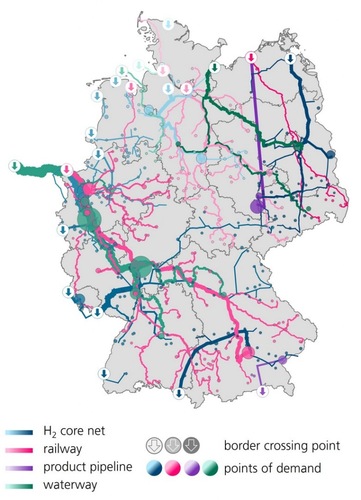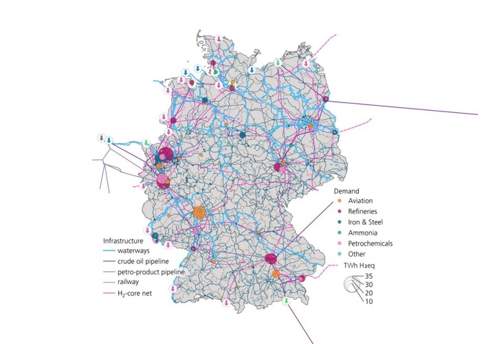 The H2 core grid plays an important role in supplying industry. The study indicates that all identified locations of potential large-scale hydrogen consumers will be reached by the hydrogen core network in 2035. However: In many cases, the transport of hydrogen (or derivatives) by barge or rail represents a possible alternative or supplement to pipeline-based site supply.