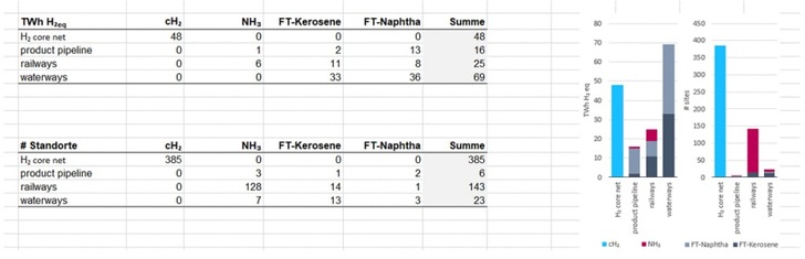 In total, there are 543 demand locations in Germany that went into this analysis. They were classified according to various use cases and investigated regarding the supply possibilities with hydrogen and its derivatives. Use cases – those are the production of ammonia, steel, petrochemical basic chemicals and synthetic jet fuels. In addition to that are the preparation of process heat in metal production and processing, the manufacture of glass and ceramics and in the paper industry. As transport modes, the study considers inland ship transport, the rail network, the hydrogen core grid and pipelines for other products. For each use case, the study lists the economic advantages and disadvantages of the respective options.