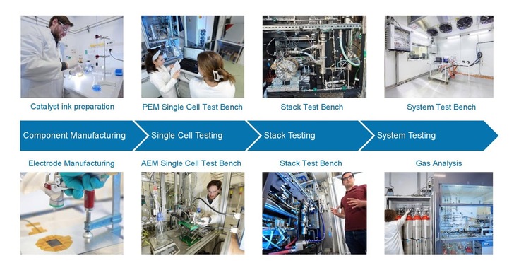 The various tests which can be conducted in these facilities include quality assessments, calibration services, performance and efficiency tests, safety tests, service life tests and examinations under real environmental conditions. Among the amenities at the 1,200-square-meter (12,900-square-foot) test center are two single-cell electrolysis test stations, two short-stack electrolysis test stations, a high-pressure test station up to 1,000 bar with climatic chamber, two multifunctional test stations, a fuel cell cathode subsystem test station, a fuel cell system test station up to 160 kilowatts with climatic chamber, a gas analysis lab, an analytical and electrochemical lab, an electrochemical compression test station, a 350-bar and 700-bar hydrogen refueling station, a test cell for hydrogen permeation and an autoclave for hydrogen material compatibility analysis of samples.
