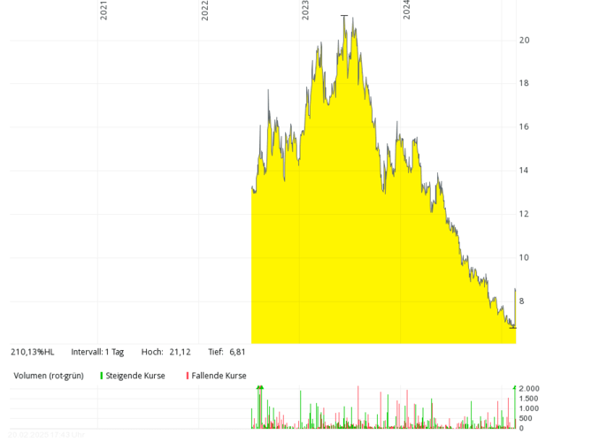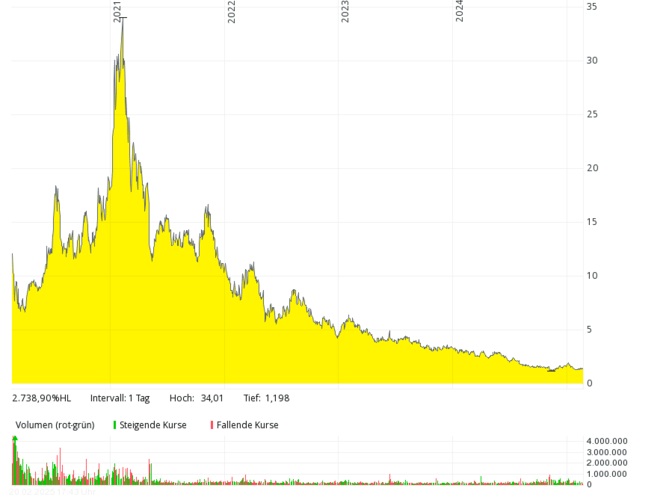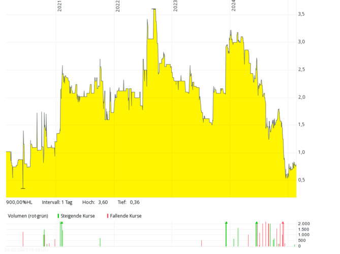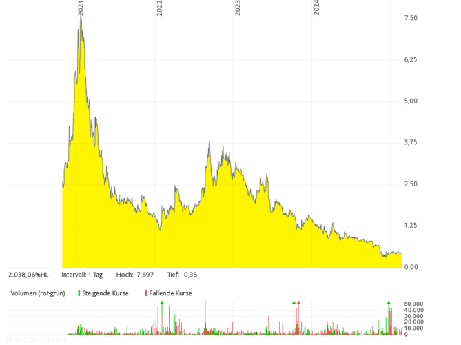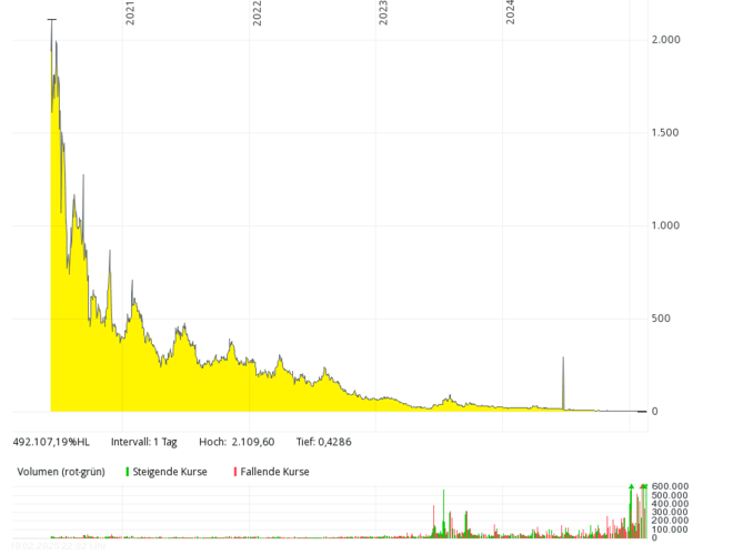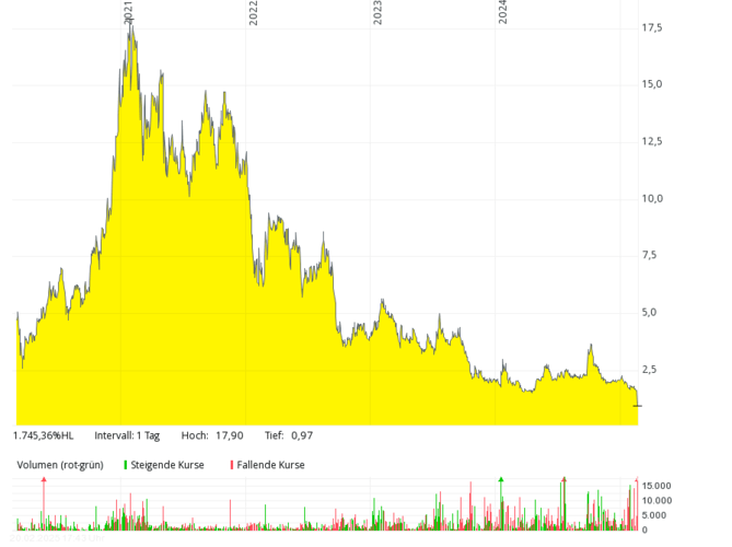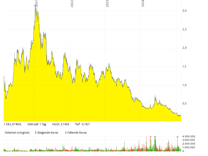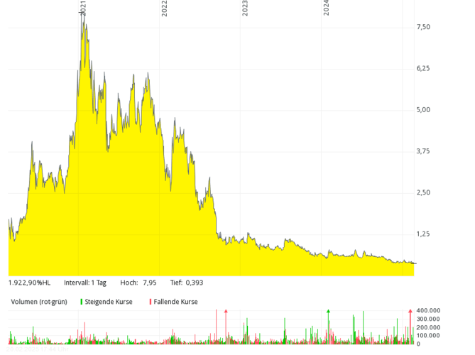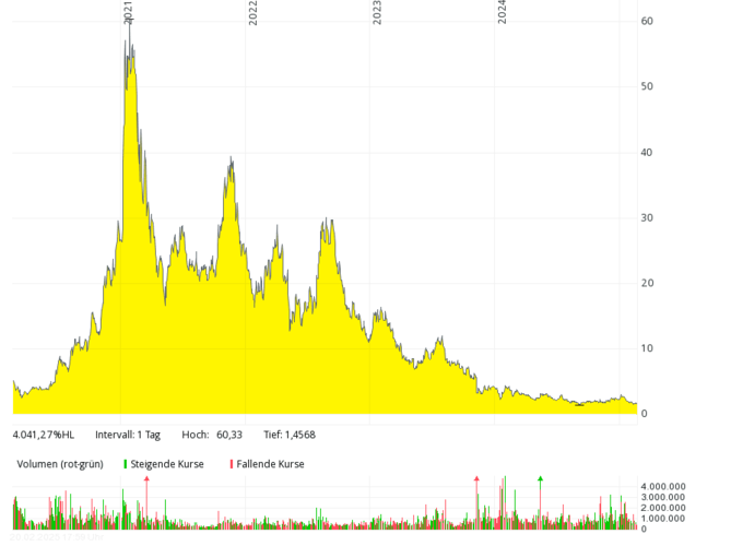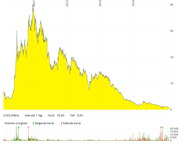 The British fuel cell company with the German subsidiary Proton Motor Fuel Cell GmbH, which also develops products in the area of hydrogen, has hardly been over annual sales of over GBP 2 million in the past seven years. In 2018 and 2019, there were only around 0.8 million pounds – with mostly higher, often double-digit million losses. The equity ratio has been negative for many years. The share price dropped from over 50 pence (early 2021) by more than 99 percent to around 0.1 pence (February 2025). In order to save costs, the management considered at the end of 2024 to take the stock off the stock exchange soon.