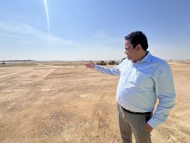 Alok Bisen, who works for the Indian steel company Jindal, showing the construction area for green steel production in Duqm