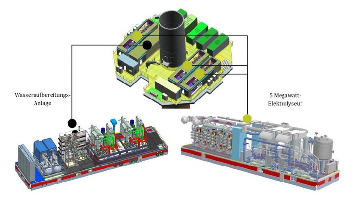 What a wind power station with integrated hydrogen production would look like H2Mare has likewise already analyzed: In the future, all necessary systems could be housed on a platform directly next to an offshore wind turbine.
