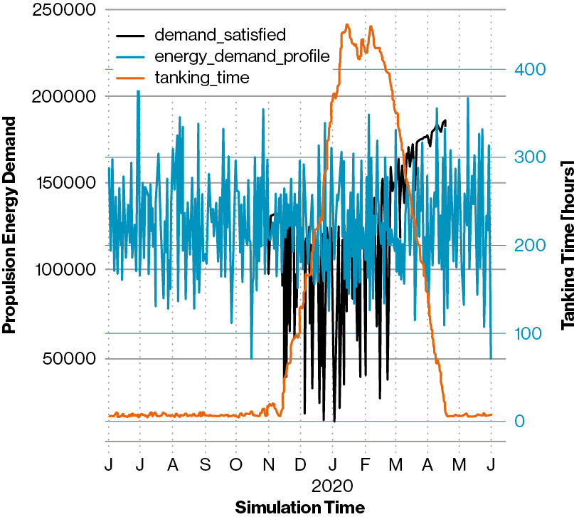 The hydrogen produced in this use case is stored locally in a depleted natural gas reservoir. The gaseous hydrogen is then transported via pipeline to the port, where it is again stored in a former natural gas reservoir, ensuring that sufficient hydrogen is always available for refuelling. Geological storage was assumed, as such sites are generally available at many locations and often also near the coast. The data situation from studies is also relatively good. However, there are hardly any large-scale technical high-pressure storage facilities, and a simple extrapolation from small storage units does not lead to meaningful results. Fundamentally, as with the electrolysis technology: if parameters are known, other storage technologies can also be incorporated into the model.
