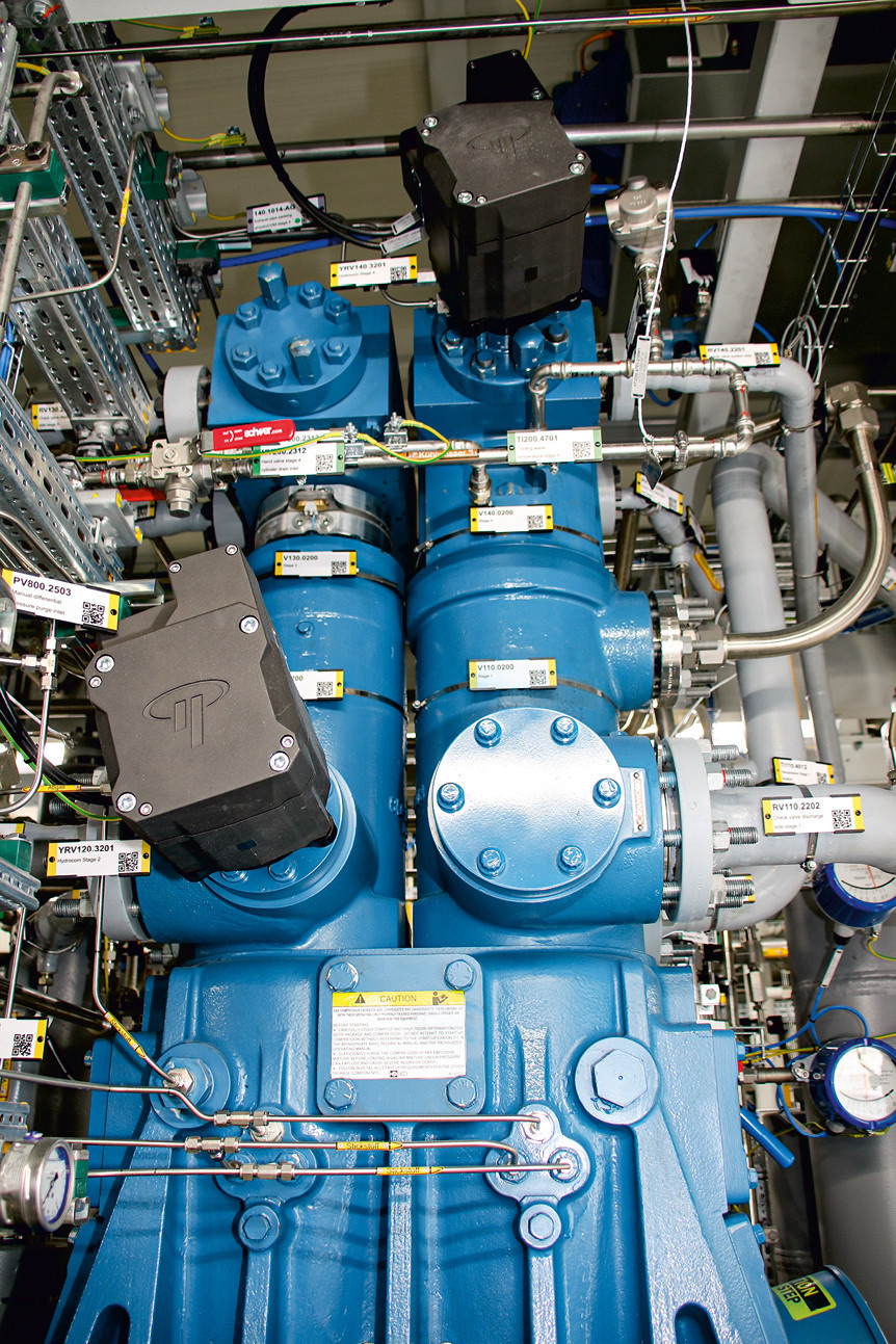The redundant dispensers with cooling unit, hydrogen control system, control unit, and payment system are in-house developments by H2 Mobility. They are equipped with a sliding swing door, allowing the cooling unit to be easily pulled out for maintenance. The entire facility is designed to dispense 2 to 5 tonnes of hydrogen per day, with the future fleet of 30 Rheinbahn fuel cell buses alone accounting for a daily demand of around 750 kg. A special feature is the Hoerbiger compressor developed in cooperation with Ariel. It is the first commercial version, following a prototype previously used by Wiener Linien.