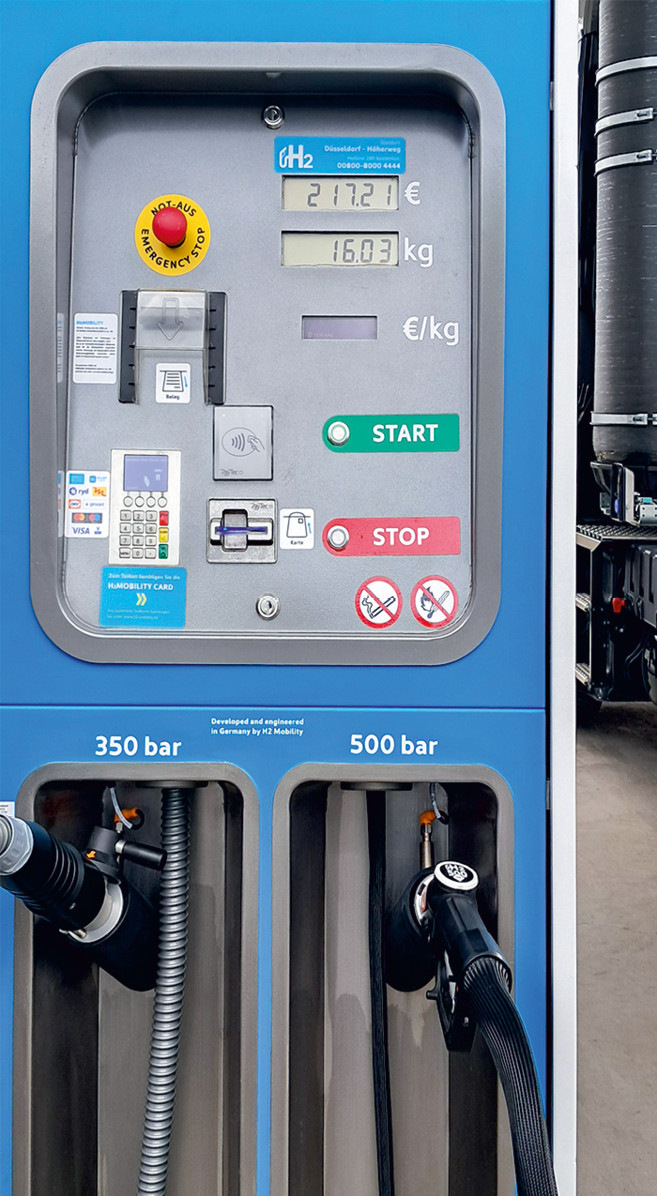 At this station, hydrogen can be refueled at 350 bar (for buses and trucks) and 700 bar (for passenger cars), as well as at 500 bar, cooled to –20°C. The latter is currently available in a test and pilot phase at the same price as 350-bar hydrogen. At present, prices at the Düsseldorf station range from €13.55/kg (350 and 500 bar) to €15/kg (700 bar). However, it should be noted that, according to H2 Mobility, these prices are close to the purchase cost.