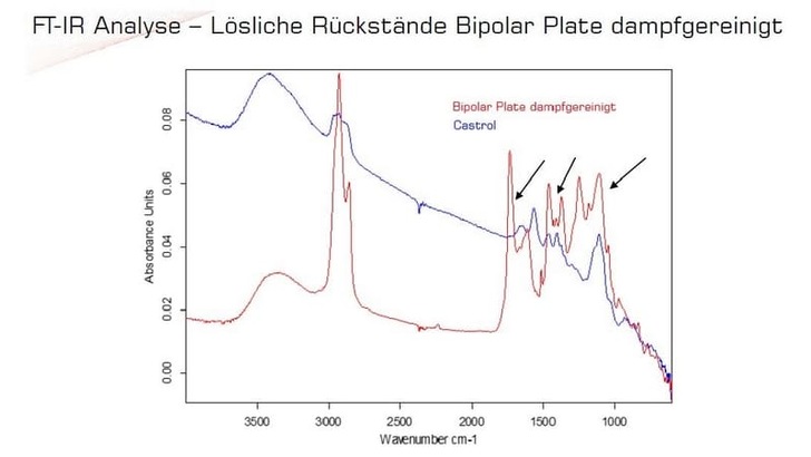A general statement about whether the component has a sufficient level of cleanliness for the next processing step cannot be made. For this to be possible, it would be necessary to determine appropriate process-specific requirements. For infrared spectroscopy, all residue on the test pieces (coil sections and BPPs) was first removed to establish a reference cleanliness. After the surfaces of the test pieces were analyzed using infrared spectroscopy, the test pieces were contaminated with reference contamination before being cleaned and then reanalyzed. This analysis then showed that steam cleaning managed to reliably remove chemical film contamination.