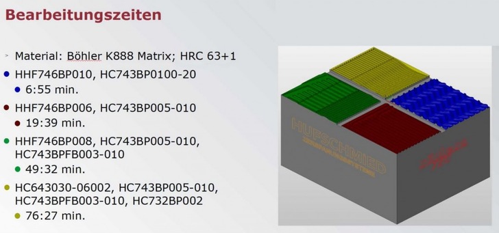 The Hufschmied tools from the Bumble-Bi series used to machine various sections of the demonstrator (50 mm x 40 mm) on the Röders system along with relevant machining times, Source: Röders/Hufschmied