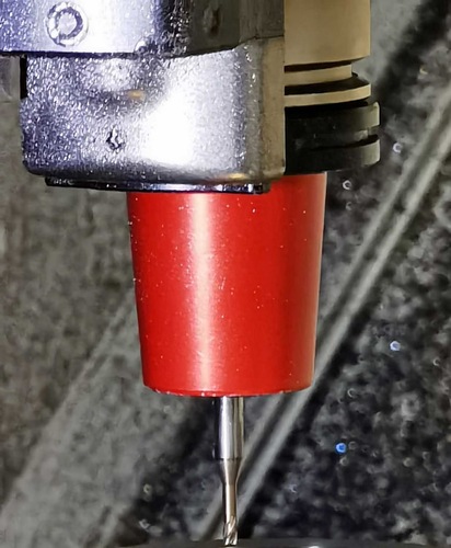 Most of the cooling and cleaning work is performed by the compressed air that is sprayed out of the nozzles arranged in a ring on the lower edge of the sleeve. The powerful air jet immediately removes chips and their heat content from the milling cutter and the workpiece. The lubricant, made from carefully selected hydrocarbons, is fed through in extremely low quantities (2 to 10 milliliters an hour). This is sufficient to ensure optimal lubrication for cutting operations. Heat build-up when hard cutting is reduced by around 50 percent. Significant advantages are much longer lifespans for tools, increased cutting performance of the machine and improved workpiece surfaces.