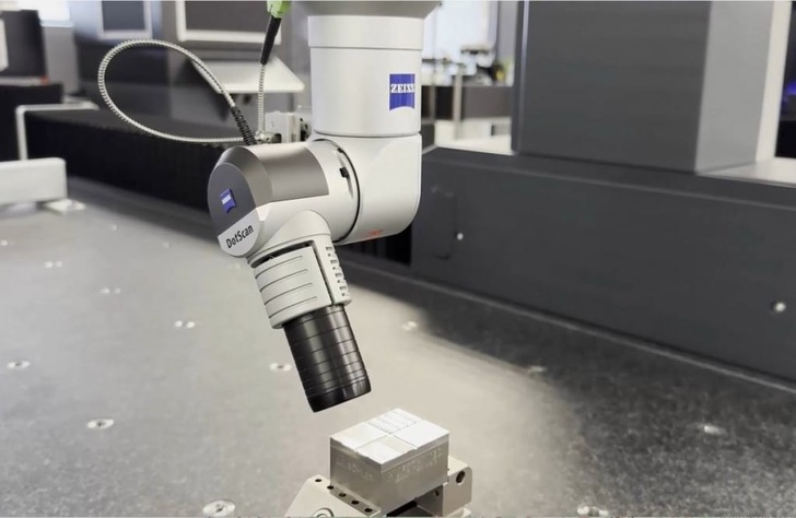 Measurement of the demonstrator using a Zeiss DotScan optical sensor with a mean percentage error of 1.8 µm + L/350. To facilitate better measurement of the sides, the sensor was moved with an RDS articulated unit and on a Zeiss Contura coordinate-measuring machine during scanning. Image: Zeiss