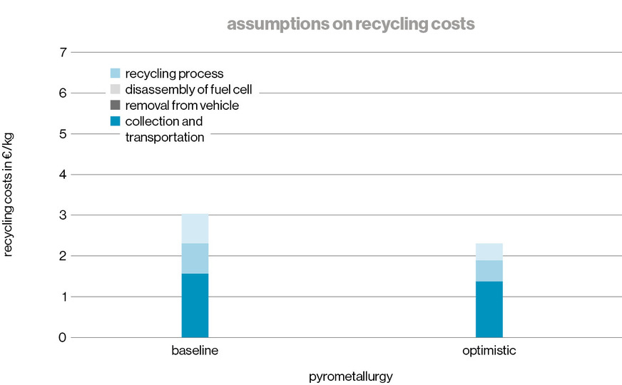 In addition, steel and copper components of a fuel cell vehicle can still be recycled as a whole. This reduces the costs, which in the example given are fully attributed to the recycled stack. Nevertheless, the costs of recycling a fuel cell vehicle will in all likelihood exceed the recoverable values.