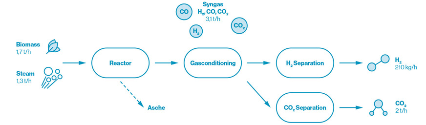 The principle of economy of scale was supplemented at an early stage by the influencing factors of biomass availability and the ability to market the produced products at competitive prices. As part of the research project, a production plant was designed to produce 1,600 t/a of biogenic hydrogen and 15,000 t/a of biogenic CO2 from 22,500 t/a of biomass. The plant enables the production of hydrogen at competitive production costs of around eight euros per kilogram and is also baseload-capable. Unlike electrolysis, it does not depend on wind or solar power.