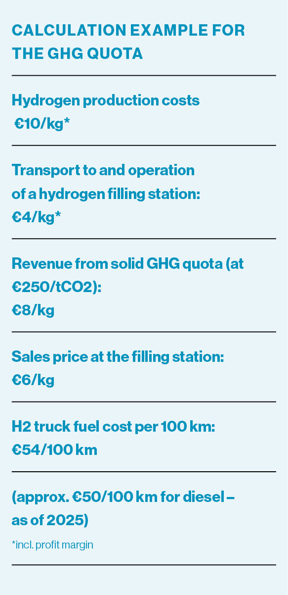 GHG quota trading: key market instrument for the hydrogen ramp-up GHG quota trading enables the economic operation of hydrogen projects without the need to keep production costs low through government investment subsidies. Quota trading leads to additional revenues from the sale of climate-neutral hydrogen and thus lowers sales prices, even with higher production costs. This increases consumer acceptance.This year, 10.6 percent of the energy content of fuels placed on the market must be climate-neutral. Those who do not meet this minimum quota must purchase CO2 certificates through certificate trading. Those who sell more climate-neutral fuels and exceed the minimum quota can sell the excess share in the form of certificates.To meet the quota, the various production methods (e.g. RFNBO, biogenic hydrogen, and biodiesel) are weighted differently. The GHG savings of RFNBO are credited threefold, those of biogenic hydrogen twofold.